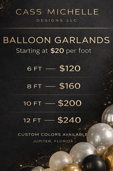 Basic designs starting around $120-$300 and complex, large-scale organic arches reaching $900-$1200+, depending heavily on size, customization such as; colors, balloon types, add-ons like flowers, backdrops, lights, fog, bubbles, carts, marquee numbers/letters, Character boards, Ball Pit rentals, cake stands, tassels/shimmer backdrops and how elaborate the display becomes.